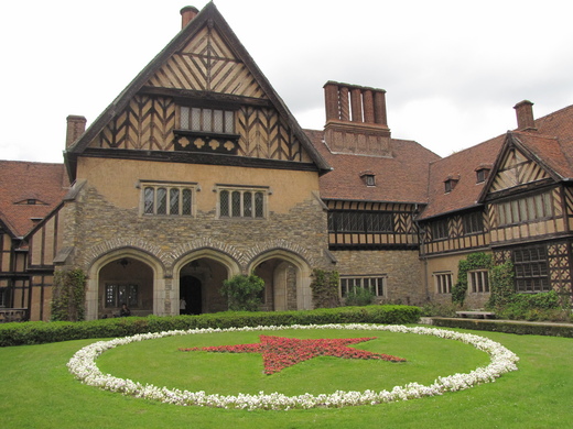 大家決定要到Schloss Cecilienhof,參觀波茨坦會議中心。雖然Rebeca的腳已經起水泡,可是她說沒關係,慢慢的走。我問老公腳後跟還疼嗎?他說:「妳不問就不痛。」一行人搭上Bus往目的地前進,宣嫂對大家招手說:「司機先生說在這裡下車」。下車後,宣嫂說:「向前走右轉五分鐘就到了。」我們一路向上走,四十分鐘後,還是一樣的上坡路,沒有看到任何的入口。旁邊有695的公車牌,有人建議如果公車來就上車。這時看到宣哥、宣嫂對大家招手,前面就是入口了。進入園內,左邊通往花園、噴泉跟湖,右邊通往城堡。二次大戰後,1945年的7月就在這裡,美、英、法、蘇四國訂立波茨坦條約將柏林分為四個管轄區。Rebeca笑著說:「忍了這麼久的腳痛,終於到了,好好的照張像。」宣嫂開心的說:「剛到柏林第二天,就自行搭車、探險,好過癮!如果參加Excursion to Potsdam一人要40歐元,我們一人6.5歐元就辦到了,太棒了!」
