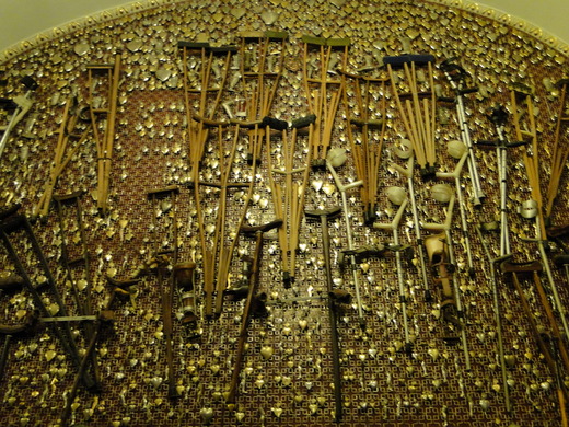 進入這聖堂,是不可以照相的。經過神父的引領,我們看到牆上掛滿了拐杖,這些拐杖都是受到聖母降福、治癒頑疾可以馬上起身行走的信友留下來的見證。其中還有一間大廳是黑面聖母的聖物,以及教宗保祿二世的畫像,還有教友及名人留下的奉獻物品,當年美國總統甘迺迪造訪時,留下來的戒指也在其中。