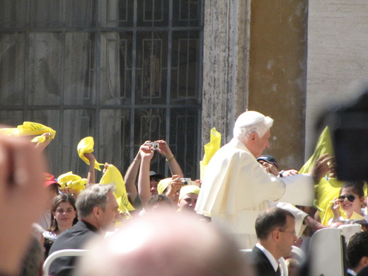 每周三的上午,教宗本篤十六世在聖伯多祿廣場上接見並降福信友們。畢神父申請覲見回來後,很開心的說:「教宗對台灣來的團體特別關心,我們的位置被安排在聖伯多祿大教堂的最前方。」果然五月十八日來到締造秩序與精...