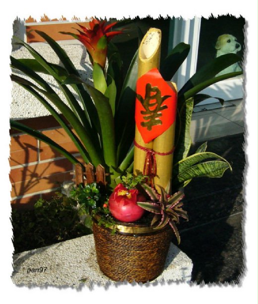 2.竹子:面向盆栽左邊是鳳梨花竹子兩支ㄧ起緊貼鳳梨花的右邊插入並且倒入所有的土壓緊固定竹子後綁上紅色結繩。