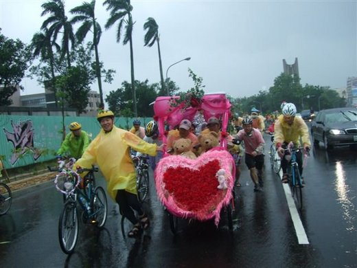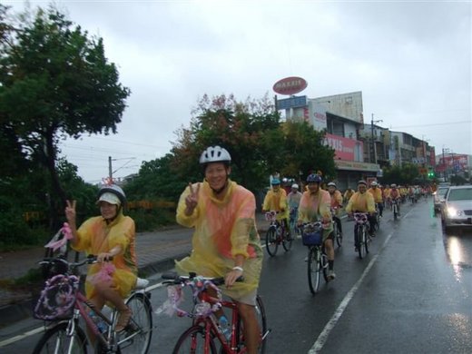 社友今天結婚,早上5:50分99位社友組成的幸福久久勇士車隊(自行車)風雨無阻,一到集合地點大夥忙著穿雨衣裝扮迎親禮車,每輛自行車前頭綁上愛心環,左右手把綁上彩帶,自行車帽上則是同心圈,而新娘禮車則是到田尾花壇租用電動車,可惜的是新人幫我們準備的幸福上衣沒機會亮相,因為被雨衣擋住了。