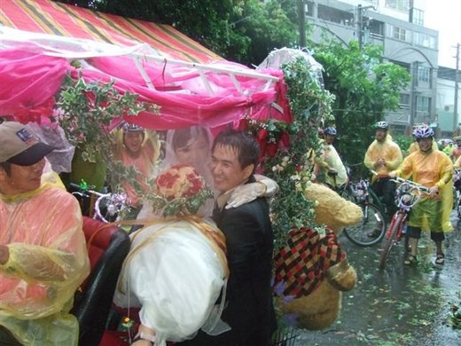 風大雨大幸福勇士出發了,沿著和平路繞到新郎的家,然後轉往台1省道北上民雄,沿途遇有人勇士們高興的喊著"阿嘉要娶某",而新娘裡車播放著"明天你要嫁給我",行人很納悶吧!!這種颱風天還出來騎自行車,知道是迎親隊伍都有著羨慕和不可思議的表情呢...