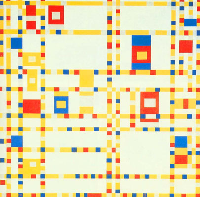百老匯是美國的一個繁華都市,那裡有著棋盤式整整齊齊的街道規劃,街頭林立著許多劇院舞廳,聚集了很多從事表演藝術的大明星,而爵士樂是當時的流行音樂,是一種節奏輕快富有情感的音樂,蒙德里安便集合了這兩種印象,完成了這一件傑作,你看,縱橫交錯的線條不就像是街道的分布,錯綜其間的大小色塊,就像一個個跳躍得音符,看了這幅畫,就不禁讓人也感染了那份愉快的心情。