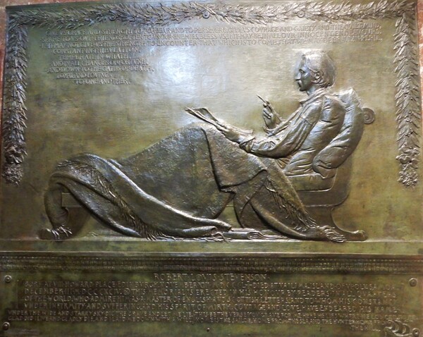 前文<書劍與香菸>提到手拿香菸變成鵝毛筆的史蒂文生浮雕,此行當然要來拜見這位"說故事的人Tusitala"。抵達第一天下午大伙就走到城堡前大街,約定了隔天進舊城堡參觀的集合時間地點(行前已預約購票),之後大家自然逛進附近的聖吉爾斯教堂。進入免門票自由捐的教堂,內部昏暗,很快在北側牆面找到史蒂文生淺浮雕,拍完照心滿意足,隨之發覺不太對,最明顯的是圓形浮雕變成方形,當時沒細究,回旅館後比對,確實與之前的淺浮雕不是同一物,如下圖,怎麼會這樣?