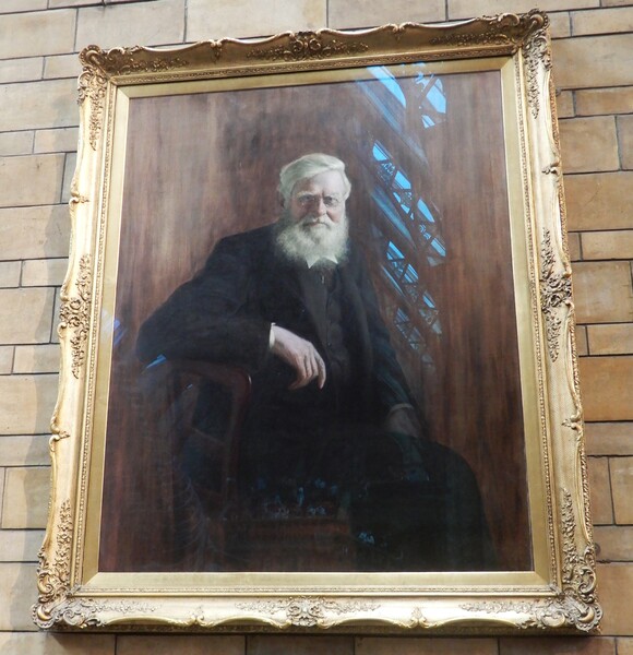 基於上述印象,此行當然要來向這位與達爾文同創天演論卻被世人冷落的博物學家致敬。冒雨走進自然史博物館,匆匆看過紅色展區,再擠過綠色展區走向中央大廳,向右走上第一層大階梯,果然看到在右側第二層階梯的牆上掛著大鬍子華萊士的畫像。