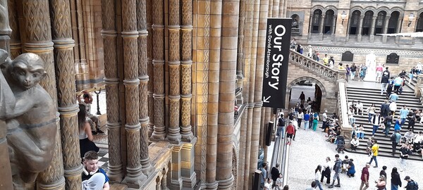 博物館華麗大廳的前部石柱上有很多隻猴子。圖中我們的故事~大衛艾登堡主講。