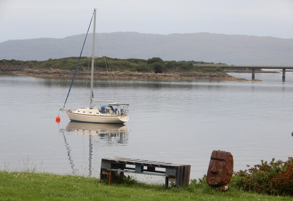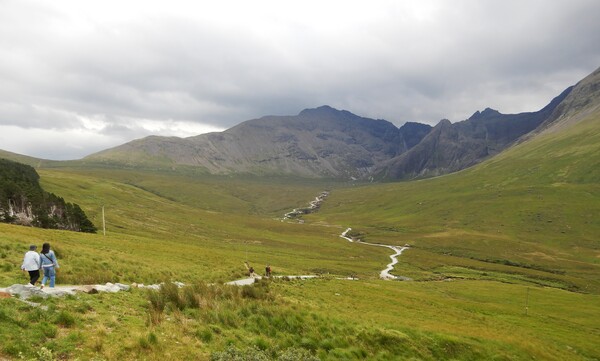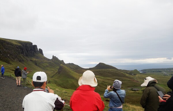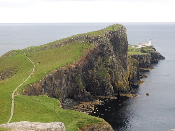 天空島並非國家公園,但為了維持其原始的面貌,地面人工設施極為節制,島上僅一條A級主幹和四條B級公路串聯,其餘都是單行的羊腸小路,所以就是七月旅遊旺季也幾乎不見遊覽大巴。通向景點的蜿蜒單線路,約每百公尺就有一個半橢圓形的會車點,車行其間走走停停互相禮讓,是一特色。首府波特里不計,所到六處景點只二處有公廁,其餘什麼都沒有,沒說錯什麼都沒有,以最西邊的Neist Point Lighthouse為例,車停道路兩邊,有一間閉門小屋,一條階梯下斷崖,通向燈塔約一公里。魯肉腳看階梯落差有四層樓高,怕下的去上不來,只得留在崖上乾瞪眼,心想此美景怎麼不弄個大停車場,再搞個纜車或棧道之類的,如果還有黑輪攤奶茶鋪更佳,遐想間忽見一大片烏雲襲來,還沒反應過來,傾盆雨下,趕緊跑進小巴,因冷,尿意驟生,又想,若能擺上二個流動廁所,一天也能收個幾十塊英鎊,唉,孤傲的蘇格蘭是不是有點笨?