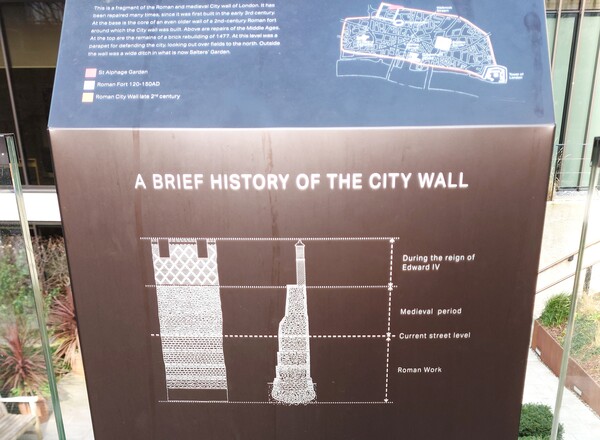 倫敦古城牆的解說牌,城牆範圍及三個歷史增修階段~羅馬時期、中世紀、愛德華四世,目前的路面約是牆高的一半。下列三張,市牆遺跡夾雜在現代建築之間,參觀時像在尋寶。