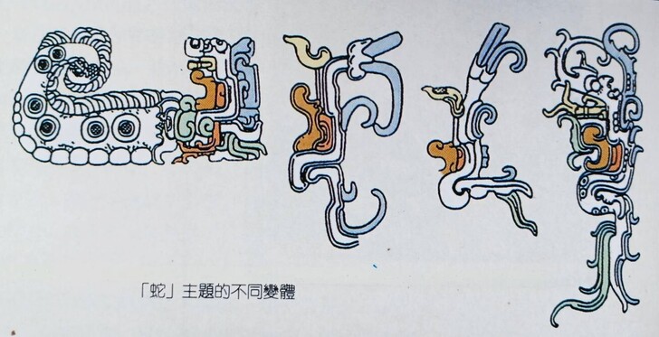馬雅文字常連帶有圖像,圖像不寫實,不是對自然物的直接模仿,所畫的東西都經過修改變形,而且各種主題的圖形穿插交織,首尾莫辨,讓圖案更形錯綜複雜。蛇是最常見的形象,蛇頭象徵神聖的權力,張開的蛇嘴常鑽出一顆人頭或怪物的頭,如下圖。