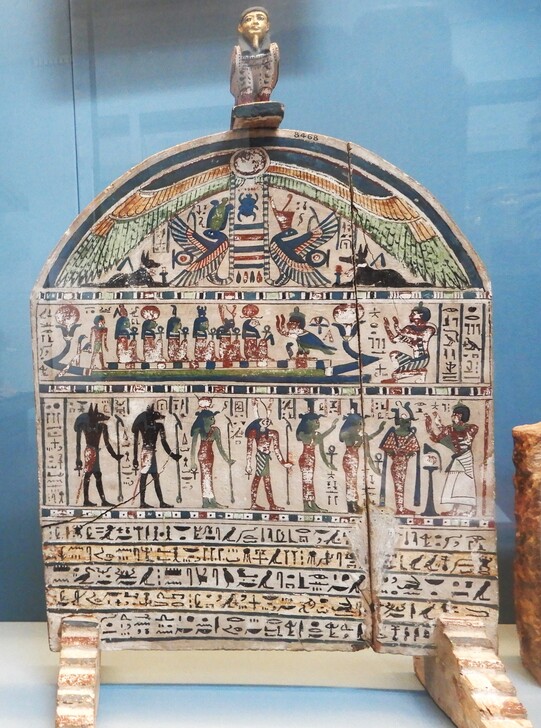 <埃及尼斯維的石碑>,頂部有一隻巴鳥的石碑分為四個部分: