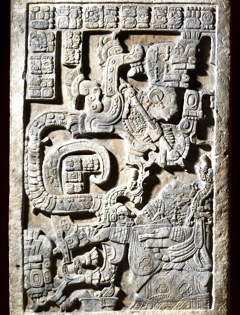 馬雅<雕刻的石灰石門楣>,描繪亞斯奇蘭國王盾豹二世的妻子修克夫人正處於放血儀式的幻覺階段,她眼前浮現出一條特奧蒂瓦坎巨蛇的幻影。最上左是文字,整個圖像塞的滿滿的幾乎不留空白,是其特色。