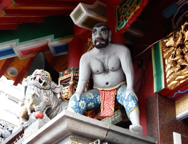 上圖是台灣廟宇常見逗趣的「憨番扛廟角」。