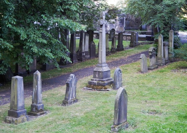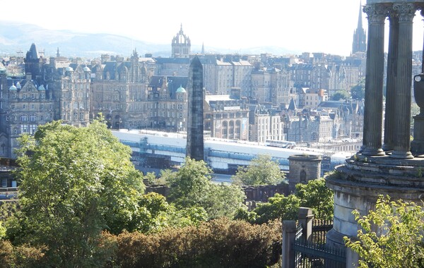 愛丁堡卡爾頓公墓的政治烈士紀念碑,背後冠形尖塔是聖吉爾斯教堂。