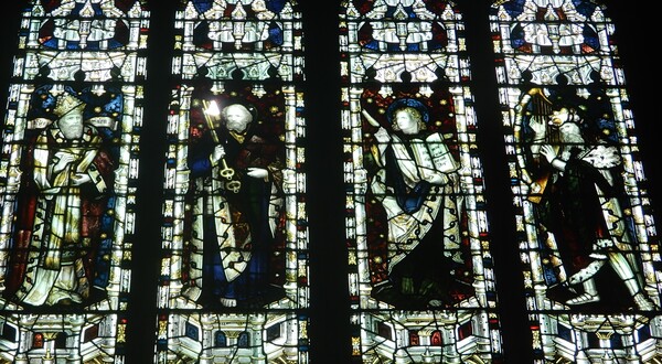 六、契斯特大教堂的彩繪玻璃,左一戴冠拿書、左二拿鑰匙、左三拿鵝毛筆與書,右一拿豎琴,四個人只知道左二拿鑰匙是聖彼得。