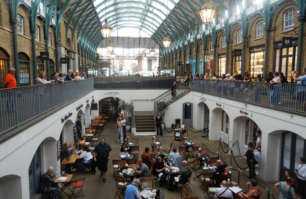十五、倫敦,柯芬園商場的中庭,中間階梯旁穿黑衣服的女士正在唱歌劇。