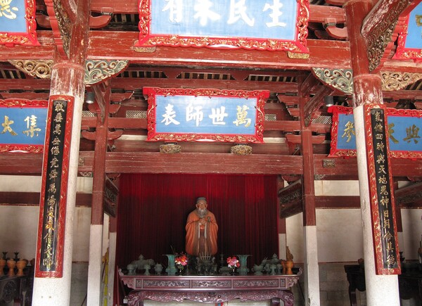 大成殿傳統上供俸孔子牌位,大陸文革後復原孔廟卻大多立了塑像是不洽當的。通常殿內上面布滿匾額,每根立柱有楹聯,呵呵,看著看著好像是去公祭的式場,吊滿輓聯兩邊是花圈花籃。儒釋道並稱三教,孔子牌位可以參拜,但孔子是聖人,不是民間的神,故應試求功名的學子都去拜文昌君或恩主公了。孔廟是禮拜祭祀場所,亦有教育功能,十多年前大陸國學熱,去漳州孔廟時是周日,看到迴廊就有讀經班,一班成年人一班是小學生,後來不知是否還持續。
