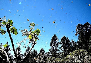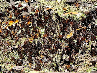 不敢和大自然爭時間和空間,也没有要在人類的世界裏稱帝稱王,我們上回是搭了飛机飛過太平洋,直接到了帝王蝶在墨西哥過冬的家,除了墨西哥簽證(學老美 ?)也要本人親往面談之外,全程談不上什麼障礙和險阻。倒是黃道吉日抓得準,成千上萬的Mariposa Monarca 或在艷陽下滿天飛舞,在盛開的花朵中吸蜜;或是前呼後擁地在溪畔飲取礦泉,或又隨著逐漸下降的氣溫,翩然返回高高在上的枝頭,成股成串地依偎在一起,準備渡過另一個海拔三千多公尺的Sierra 寒夜。