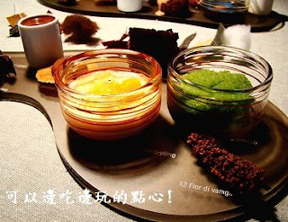 原來搭配這一道共12種口味、香味和口感各異的巧克力,既非糕餅,亦非甜酒,而是12種不同質料的小方布塊。食客得從左至右,在嘴裏品嚐每一種巧克力的同時,也用指尖(應該都是用食指和大姆指)去觸摸相對應的布料。