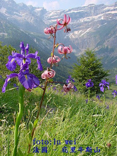 這種百合個子不大,開的花大概也只有台灣野百合的1/3,雞蛋大小,加上它性喜高寒地帶,平地上不大容易看到,法國有些地區如普羅旺斯山區,已經把它列入保護名單。其實即使在山裏,我看也不容易碰到這種花,至少我在歐洲兩大山系(庇里牛斯、阿爾卑斯)生活和跑了那麼多年,就很少碰到過。而且真讓我碰上了,就像左邊照片裏這株,我們那回在庇里牛斯山裏走了8小時,也就只碰到它一株,和滿山坡整片,整片的紫色鳶尾花對照之下,雖然令人驚艷,但下山時撇下它一個人…一株花,好像也為它感到孤單。那是2004年的事,05和07年我再去那一帶健行,不知是當年節氣不對,我們日子不對還是….我嚮導也迷了路,呵呵,反正一路都没看到。
