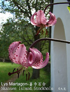 没料到這回去北歐在斯德哥爾摩的Skansen島上和它不期而遇,也是一個人躲在老教堂的一角地孤芳自賞。孤芳? 根據我手上的阿爾卑斯山花手冊,這種百合是日升開花,但卻是深夜才送香! 嗯,下回再上山,得試試在她身邊睡一晚,省了房錢,還體會體會蕃仔頭巾的夜來香!