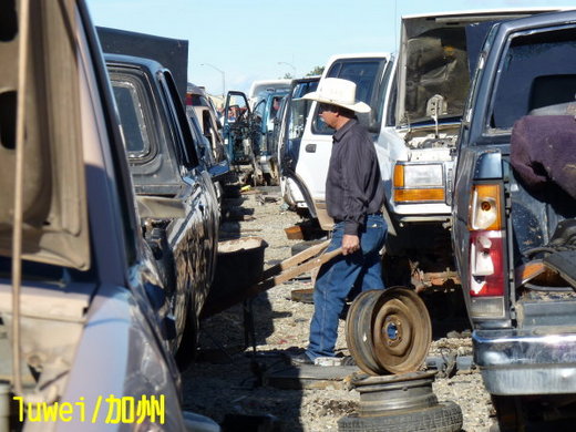這和史坦貝克有啥關係? 因為雖然美國地大宅大的,很多路邊 junk yard不算稀奇,但我總以為 Junk Yard 就是垃圾場,所有的破銅爛鐵最多就是美國資本主義的成敗見證唄! 可是這麼壯觀的汽車墳場,几千輛廢車還依廠牌分類,編號,而且竟然還有一堆人拎著工具箱在裡頭尋寶! 這可令我大開眼界! This is real recycling (真正資源回收!) 二哥看我發呆,笑嘻嘻地說。也虧我這二哥雙手萬能,不! 他是雙手十萬能,什麼都修,才會在已經有4輛大小車子之後,還在他工作房裡集了1輛60年代廠的VW小巴、1輛50年代廠的金龜,和1輛40年代廠的…who knows what? 我看學藝術學到像他這樣從玩陶器,吹彩色玻璃,打設計花鐵,到黑手修車的,還真不多見! 反正進了那汽車墳場,他那股子興奮和我完全無用的對比,不得不讓我想到”憤怒的葡萄”裡,和Joad 一家人逃難的 Cassey 說的 "Funny how you fellas can fix a car. Jus' light right in an' fix her. I couldn't fix no car, not even now when I seen you do it."(我服了你們這些會修車的人。就醬子2下子就修好了。我沒那個本事,就算現在看過你怎麼弄還是不會!)