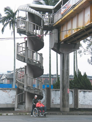 新竹縣關西高中旁的「新中豐陸橋」樓梯設計成螺旋狀,寬度又窄,老人家望而興嘆,根本走不上去,年輕學子說「轉個幾圈上去,又轉個幾圈下來」,走下來頭暈暈,還有人反映「好想吐」。