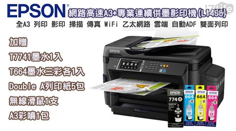 只要24,350元(含運)即可享有【EPSON】原價26,990元網路高速A3+專業連續供墨影印機(L1455)1台,購買再加贈T7741墨水1入+T664墨家電水三彩各1入+ Double A列印紙5包+無線滑鼠1支+A3彩噴1包!
