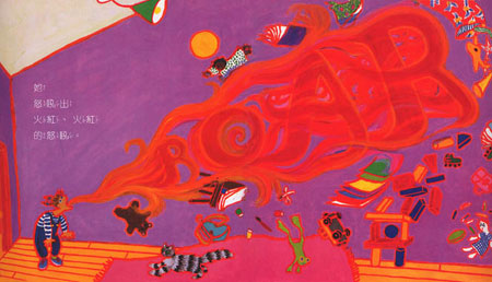 「菲菲生氣了」一書,正是作畫者莫莉‧卞回憶童年生氣時的一個經驗寫照。菲菲的玩具大猩猩被姊姊搶走,媽媽又不站在自己這邊,所以菲菲就氣得怒髮衝冠,又踢打 、又尖叫,甚至想把所有的東西都砸掉,接著,她怒吼出火紅的咆哮來,像一座就要爆發的火山般,叫人看了膽戰心驚。