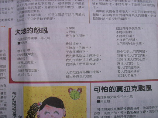 【玫伶童詩】大地的怒吼~刊登在2009/09/27中華日報