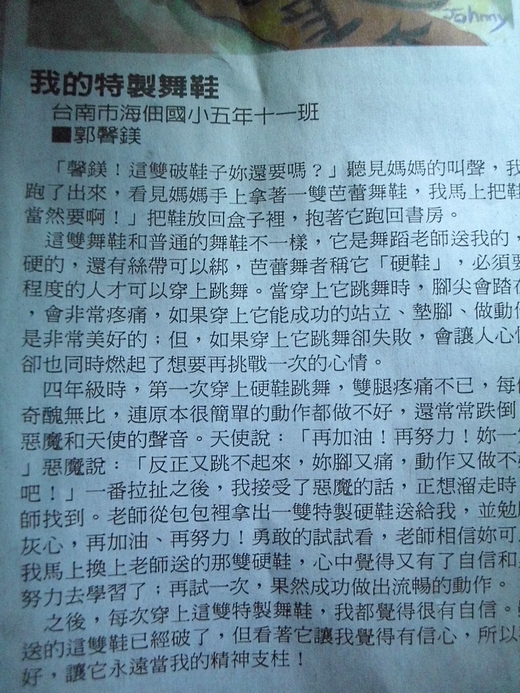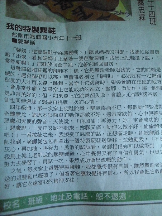 【馨鎂作文】我的特製舞鞋~刊登在2010/07/25中華日報
