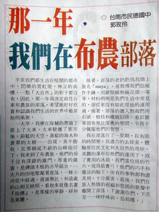 【玫伶作文】那一年,我們在布農部落~刊登在2011/09/25台灣時報