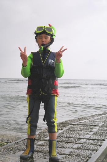 一到島上,行李寄放在民宿後,大家就迫不及待地跑去浮潛。本來玩得很盡興,但一連幾個大浪打上來,妹妹有點害怕,就先上岸;姊姊愛玩,又和大人去玩第二趟。