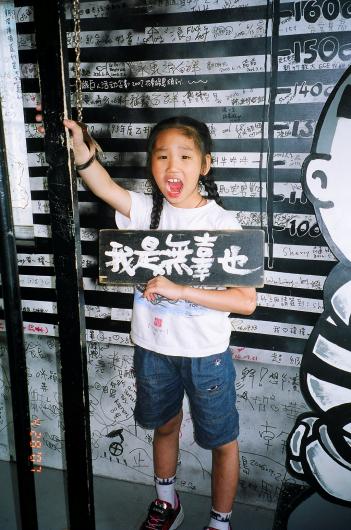參觀《大哥的店》,融合監獄情境的紀念品販賣店;妹妹對各種道具都好奇,到處拿道具要求拍照。