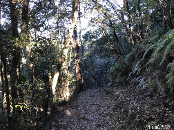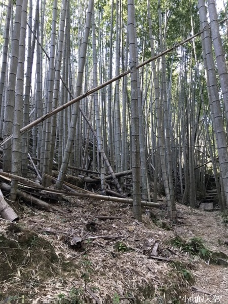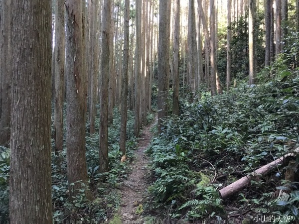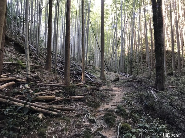 這段山道走在密密的杉樹與竹樹之間,部份樹木因颱風來襲時折損。