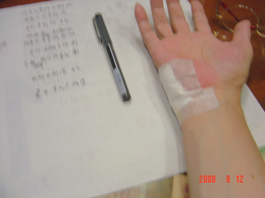 雙手貼滿白膠布