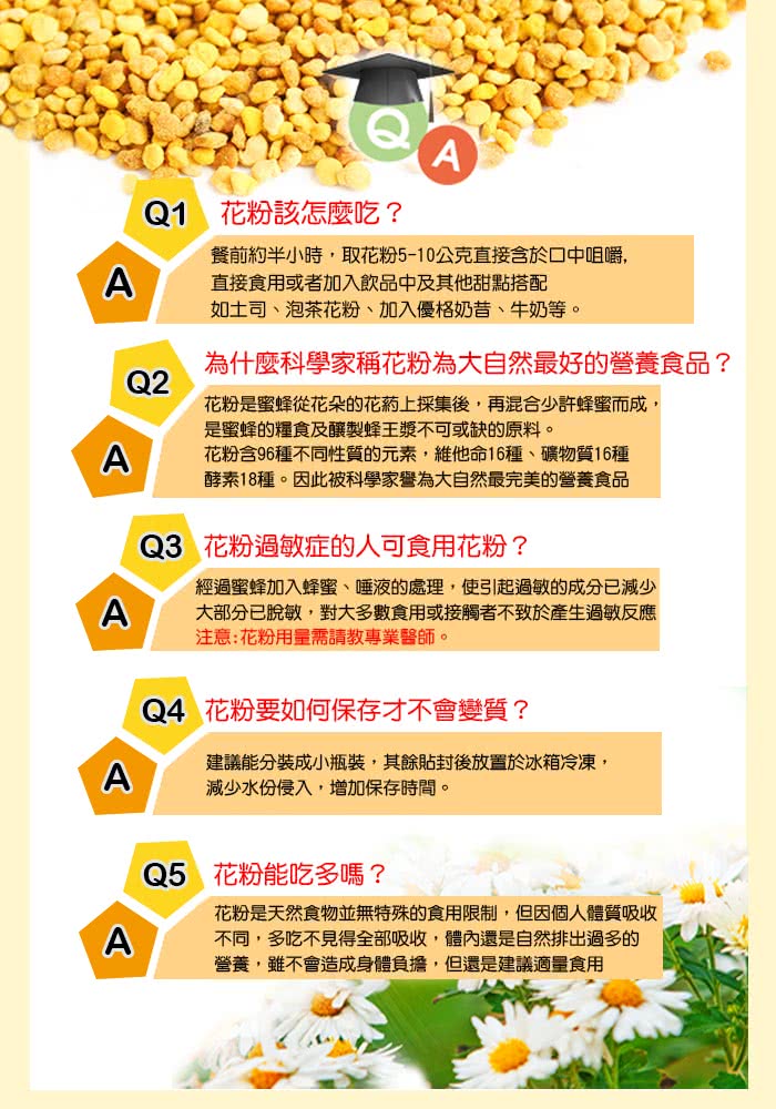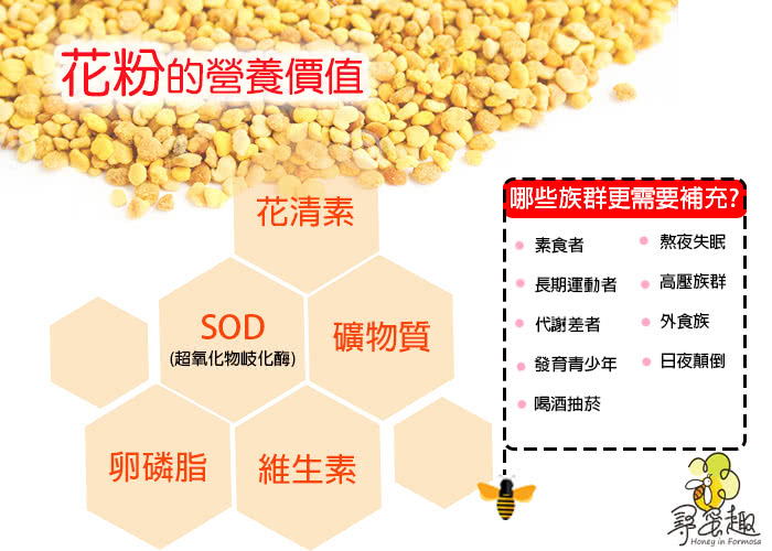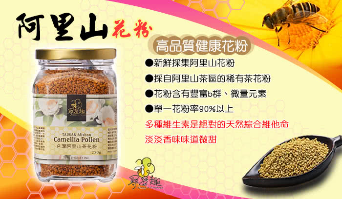 | 天然的綜合維他命 採自阿里山茶區的稀有茶花粉獨特的淡淡香味,味道微甜花粉含有豐富b群、微量元素單一花粉率90%以上 |