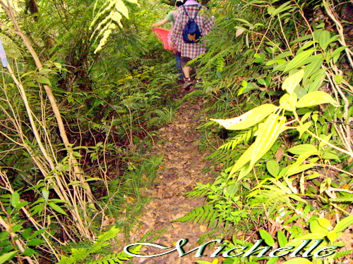 帶隊的往那走,我才知那才是今天真正要走的路,那路寬平均約50cm不到,走的真的是有點膽顫心驚,而且一路大部份的路段都是往上的斜坡,一直到過了一小段的碎石坡路段,再走個10分鐘左右開始下坡,那就表示快到目的地了!