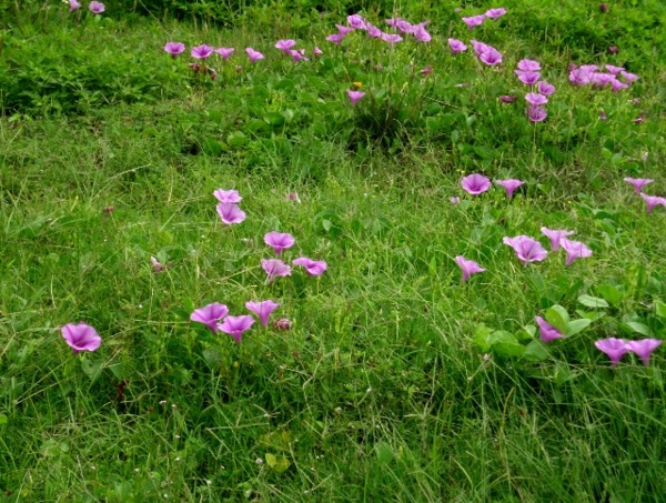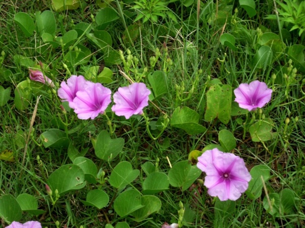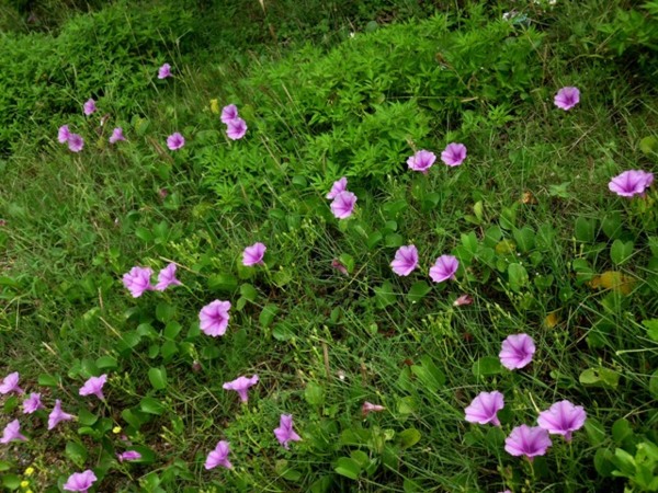 遠遠望去很多人會誤認為是牽牛花,近看才發覺其實不是,雖然它的花型顏色都跟牽牛花相似,葉子卻完全不同,馬鞍藤的葉子比較油亮厚實,襯托得紫色更鮮豔,牽牛花大都往上攀爬,馬鞍藤則在海岸附近、沙灘等地蔓延,整片的花美麗異常。