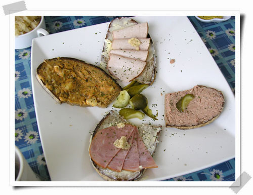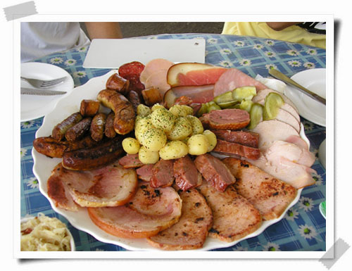 跟服務生點完餐之後,兩大道德國香腸拼盤及綜合麵包拼盤很快就上桌,看到食物頓時有點傻眼= =+,大大的盤子上裝滿了各式各樣的肉片和各種口味的香腸,中間搭配不少圓狀的馬鈴薯球,還附上一杯滿滿的酸菜,光是視覺就有飽的感覺了...