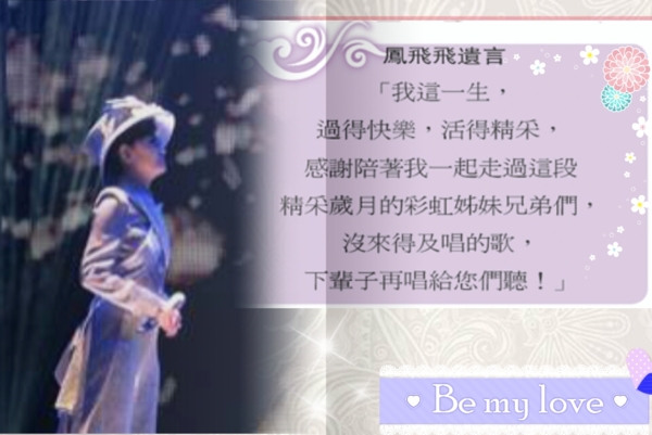 鳳姐遠行三年了,鳳迷朋友們除了思念還是思念,很多朋友不吝於分享所有我曾經錯過的美好,還有很多朋友努力凝聚這份思念,舉辦鳳學讀書會、台灣歌謠讀書會、彩虹舞蹈團、製作影片、分享珍藏…各種形式的活動,公益表演、愛心捐贈…傳承著鳳範永恆不滅的精神,深深的感謝您(們),五月溫馨的季節,祝福所有朋友們 ~ 母親節快樂!