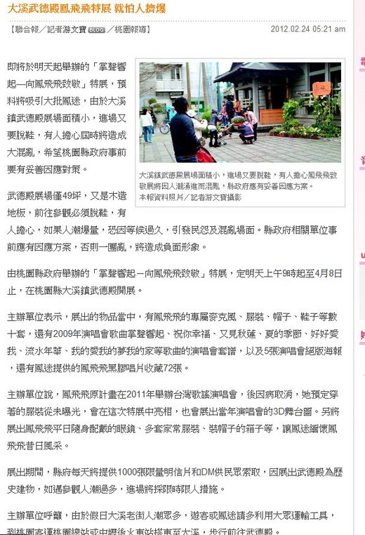 如果您曾經看過演唱會尾聲,大家爭相與鳳姐握手的情景,您一定也聽過歌曲間,不斷傳來她不斷提醒大家~小心.小心的聲聲關懷;盼望大家能把這份溫柔關懷帶到~大溪鎮武德殿,把內心最深的祝福送給她,祈願用愛護她的心,默默祝福,也誠摯的感謝主辦單位.大大娛樂公司.鳳迷們無私的奉獻與分享.......,感恩成就「掌聲響起~向鳳飛飛致敬」特展的許許多多人,為她傳遞感謝的心,給所有追憶她的朋友們,在她最愛的土地上,寫下最美麗的故事..........