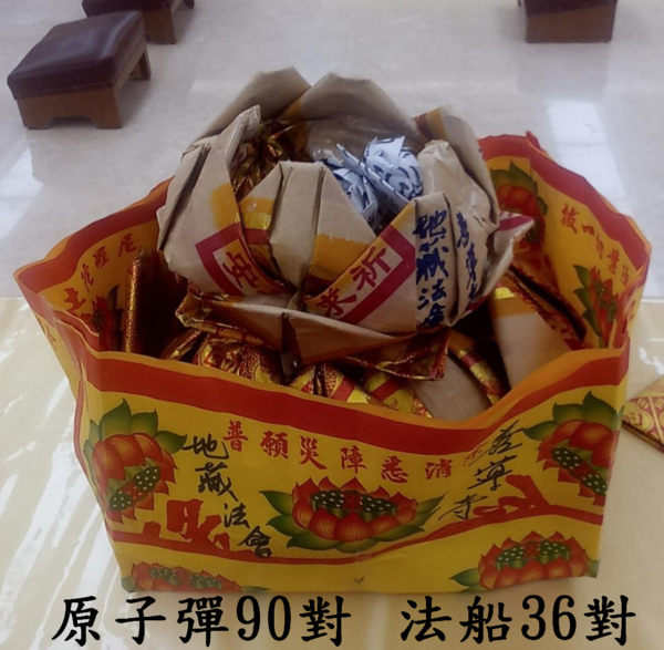 更正:更新的通靈顯示:5/22原子彈不是被偷也不是被搶,而是別處普渡需求,先行調用,光明正大地拿走。我5/27赴地藏庵燒孤兒院蓮花給我的業障(註a),順便擲茭問,結果地藏王菩薩說是調用!非偷也非搶。可知原子彈真的非常珍貴,正神界也是爭相借調。再擲問以後原子彈應該給10號金舖還是給環保局燒?答案是兩邊都可以(都有派兵去保護)。不過我還是覺得先嗇宮最可靠,大廟內燒,但一定要在上午11點以前完畢。郭媽廟現在也是金紙集中起來送往環保局焚化爐燒。