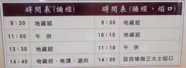 ◎下為善導寺地藏法會時間表,每天都在一樓玉佛殿舉行,採桌椅坐唸,自由入座,隨到隨唸。中午都有可口素食免費招待。時間表分左右兩部,左表為一般日,地藏經分上下午唸完。右表是國曆10、20、30號,上午就把地藏經唸完,下午放焰口到晚上。平日每天輪值四位和尚帶班唸。由於時間長達240天,法會消災超渡牌位高昂,一般網友不可能負擔,大家多多現場參加共襄盛舉,即可功德無量。舉凡諸事不順、多病,自覺業障深重者,可多多把握此難得機會,天天來參加,大消業障。(網路共唸使用H表)。 刪!刪