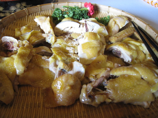 特別的是,裝雞肉的不是一般的盤子,而是類似竹篩的東西,