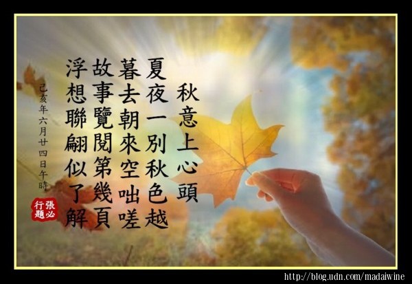 - 火焰熊熊燃燒以後,除了灰燼還能留下什麼?情意稠濃熱戀以後,是不是註定要珠淚婆娑?強忍淚,頻回首,捨不得,又奈何?滿眼新綠春依舊,濃濃秋意偏上心頭,憑添許多愁....愁?無意聽到這首離我好久好久的歌,再查閱了歌詞,似乎有感到秋天即將到了!無論是秋決、秋颯、秋意濃…等等,在歲月之前,不管願不願意,我們就得接受《秋意上心頭》