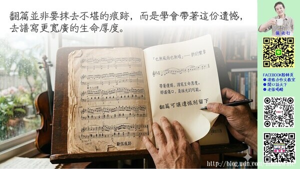 一、優質章章的範文→破題:翻篇可讓遺憾別留下 書架上那本琴譜,邊角因無數次的摩挲而泛起參差的毛邊,指尖不自覺地停留在第十八小節——那是我生命中一段「難翻的篇章」。回憶拉回當年的全國大賽,掌心滲出的冷汗...