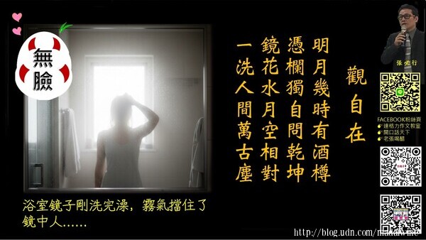 《觀自在》 明月幾時有酒樽,憑欄獨自問乾坤。 鏡花水月空相對,一洗人間萬古塵。 想像一下,剛洗完熱水澡,浴室裡還熱騰騰的,你站到鏡子前想撥一下頭髮,卻發現鏡子裡只有一個白茫茫的人影。霧氣如蟬翼般輕...
