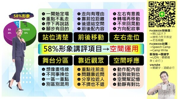 有人說,演講有58%來自形象,而空間就是形象的放大器。你站哪裡、什麼時候走、怎麼停,都在替內容加分或扣分。今天的講評,我們就從「空間運用」的角度來看,你是如何讓演講變得更有力! 1.【一般風格講評】 ...