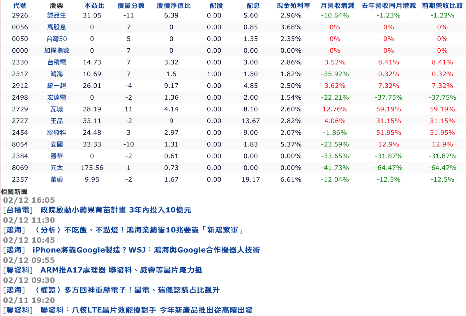 自選股下方會自動篩選出三天內自選股相關的新聞,最多會列出30則,這樣非常方便,因為有時候突然看到手中股票大漲,不知道是什麼原因,結果剛好看到下方新聞說接到大單,哦~~!原來如此。