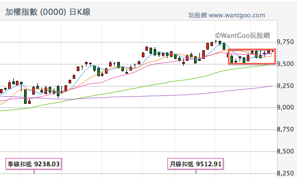 但是如果說要走這個版本的話,盤整區間通常是上下震盪,不是像現在這樣,幾天都頂在盤整區間上緣(下圖)